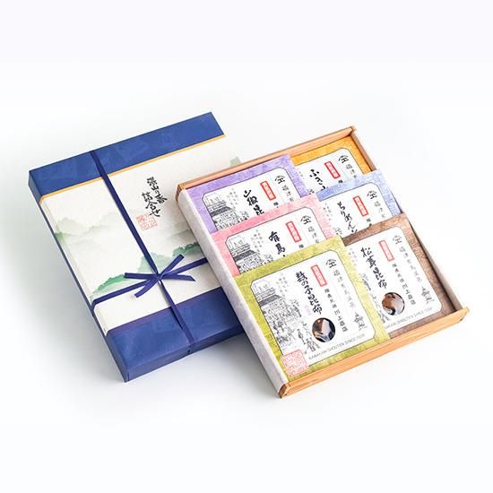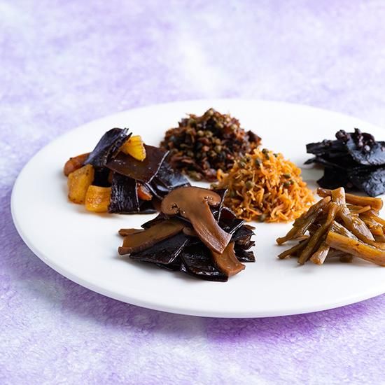 定番の「松茸昆布」「有馬煮」、「ふき山椒」「山椒昆布」「ちりめん山椒」に季節限定の「数の子昆布」を加えたこの時期ならではのご贈答用の詰合せです。