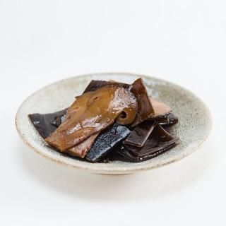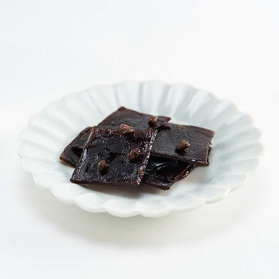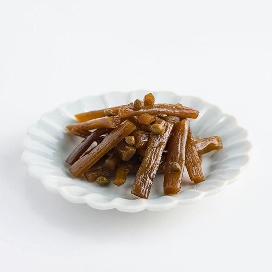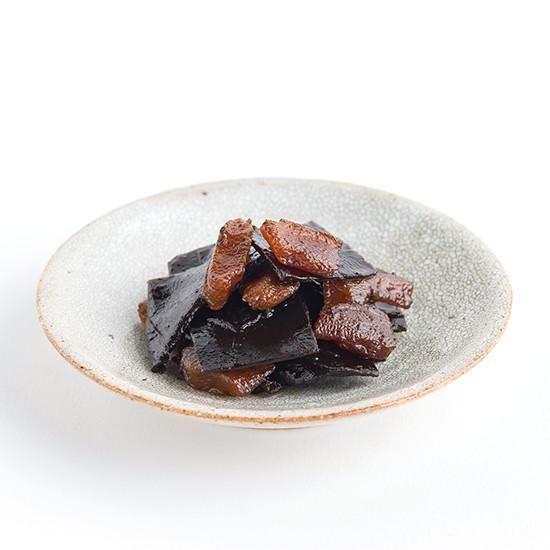 味わいの上品さが特徴の道南産真昆布と有馬山椒を炊き合わせました。「かまど」でじっくりと炊き上げ、厚くモチモチとした昆布に山椒がピリリと効いています。素材のうま味が詰まった佃煮です。