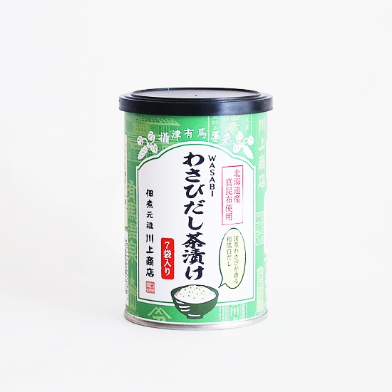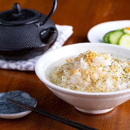 さっぱりとした和風白だしに碾茶(てんちゃ)とピリッと国産わさびの辛さを効かせた、さらりといただけるお茶漬けの素です。